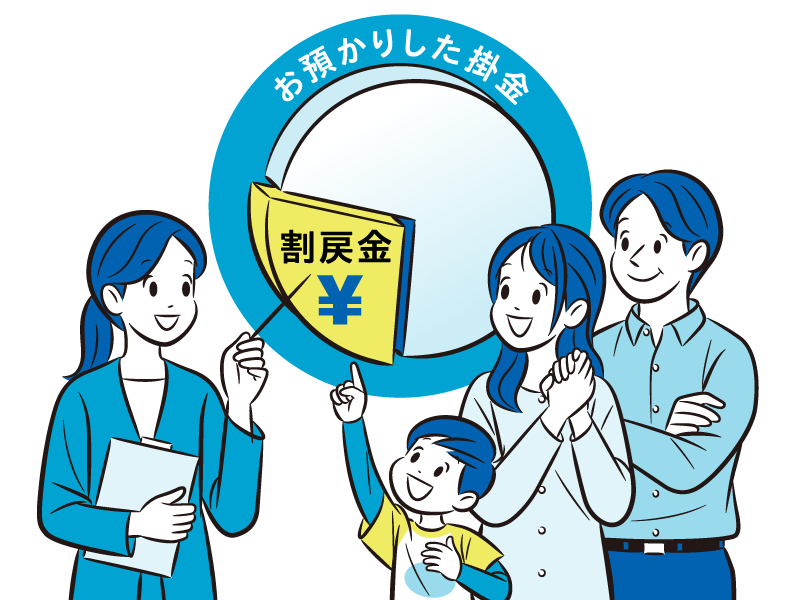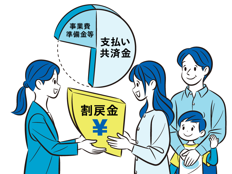 共済は、加入している皆さんが掛金を出し合い、万一に備える仕組みです。1年間の運営で、お支払いする共済金や必要な経費を差し引いた後の残ったお金は「割戻金」としてお戻ししています。