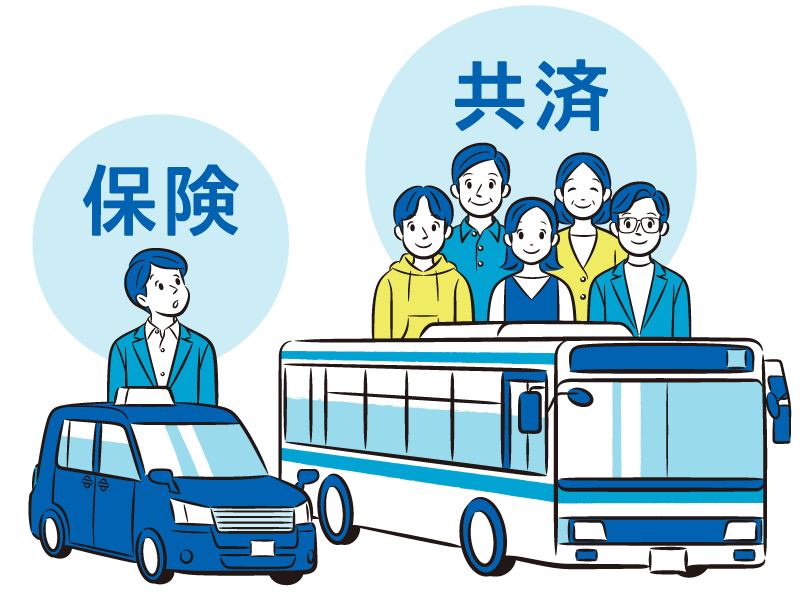 保険をタクシーに例えるなら、共済はバスのようなものです。 タクシーは自由に目的地へ行けますが料金は高め。一方、バスは停留所から停留所まで路線や下車地点が決められていて、 多くの人が利用するため、とても安く乗ることができます。